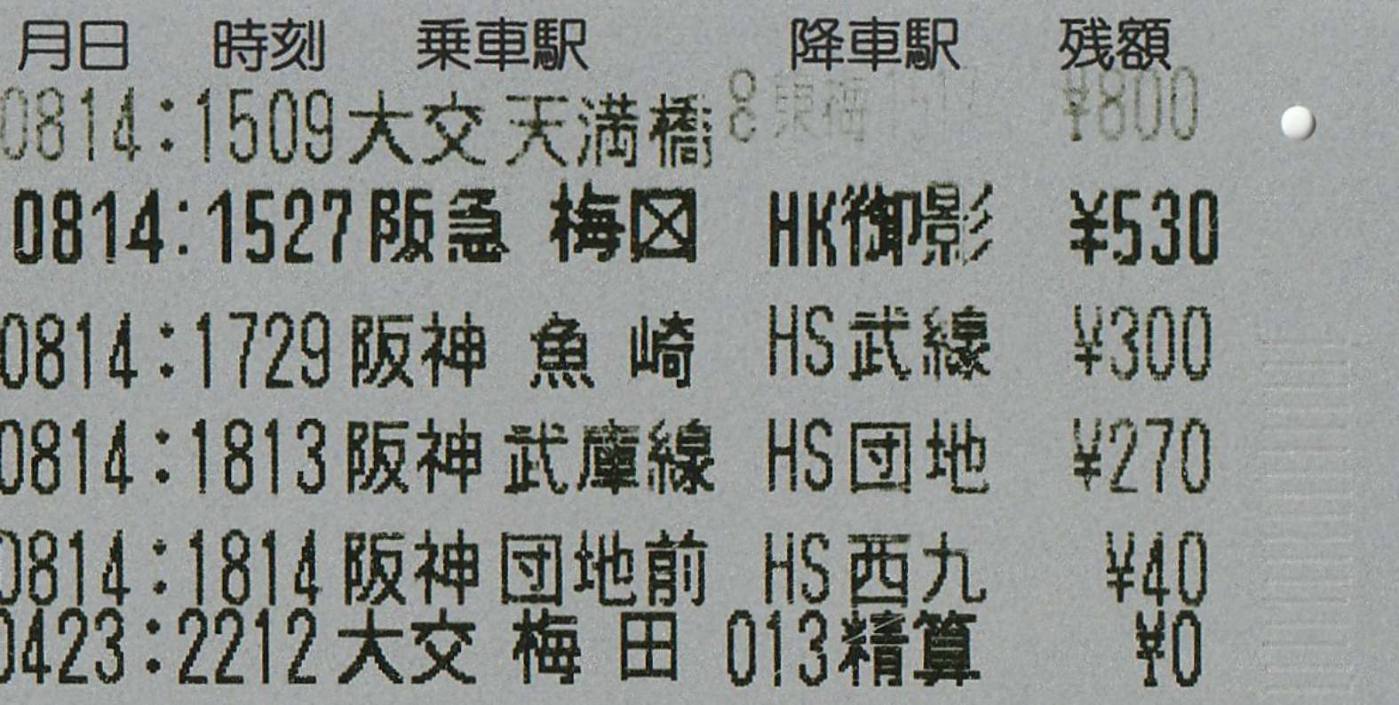 余談ですが、まともに見る人が少ないであろう磁気プリペイドカードの印字まで「口に×印」で徹底していて、一種の執念のようなものを感じます。逆に一番下の大阪市交の「梅田」表記の方がヘンに見えてくるから不思議です。