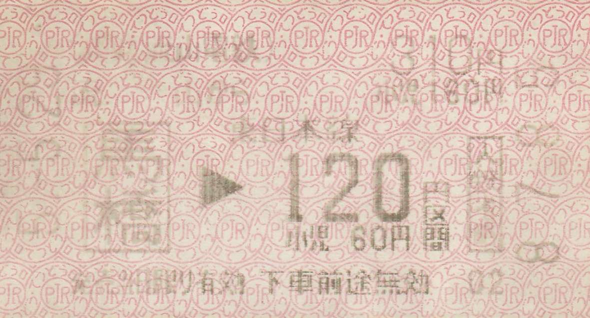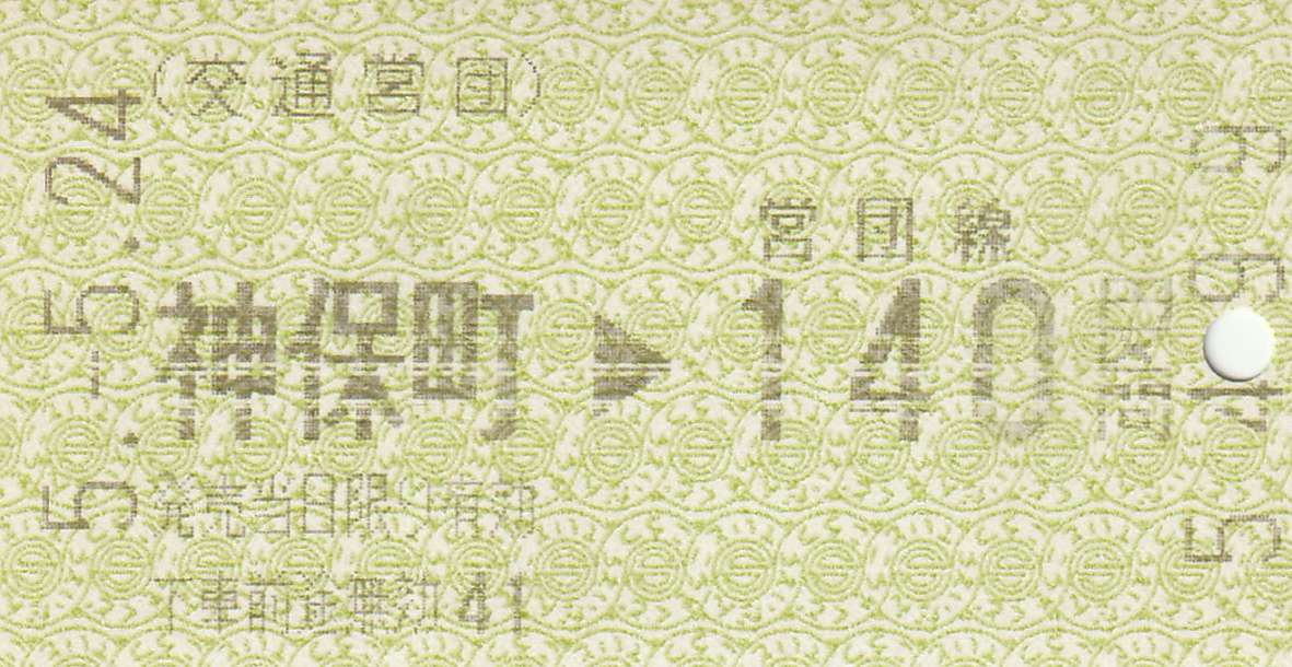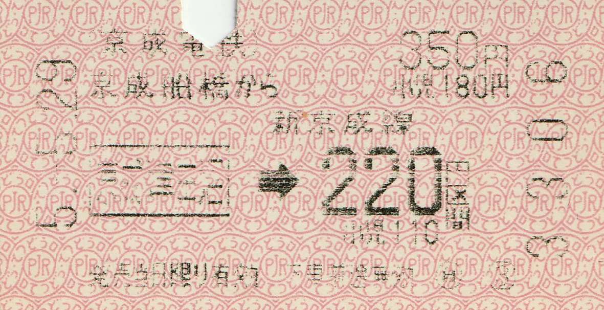 こちらは字が消えかかっていますが、京成電鉄の京成船橋駅から京成津田沼駅経由の新京成電鉄(現・京成電鉄松戸線)乗継きっぷです。京成電鉄も大手私鉄ながら当時はPJR地紋の用紙を使用していました。