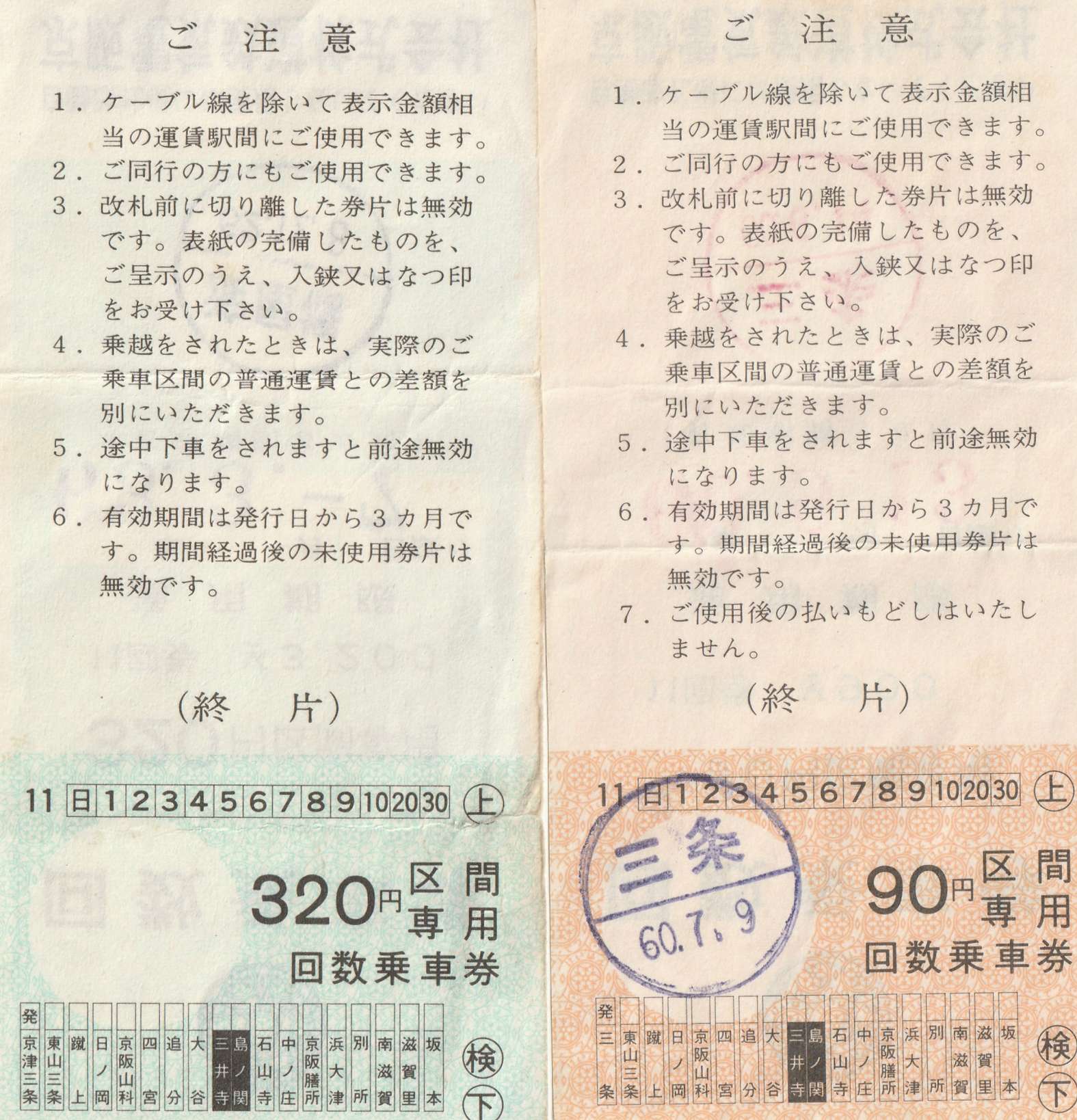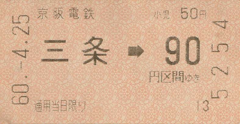 京阪電鉄のきっぷには「途中下車前途無効」の文字がありません。かつての京阪では指定駅(京橋、枚方公園、伏見稲荷、三条など)に限り途中下車可能だったためですが、この途中下車制度も1995(平成7)年10月限りで廃止されています。