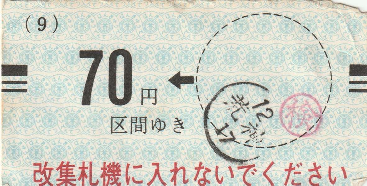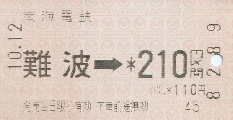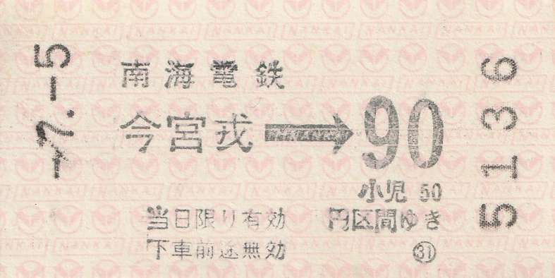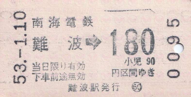 同じ鉄道会社でも、インクスタンプ式のきっぷは駅によってフォントや記載事項など微妙な違いがありました。下の今宮戎駅の券には年表示と発行駅の記載がなく、駅名と金額の間の矢印が妙に長かったりします。
