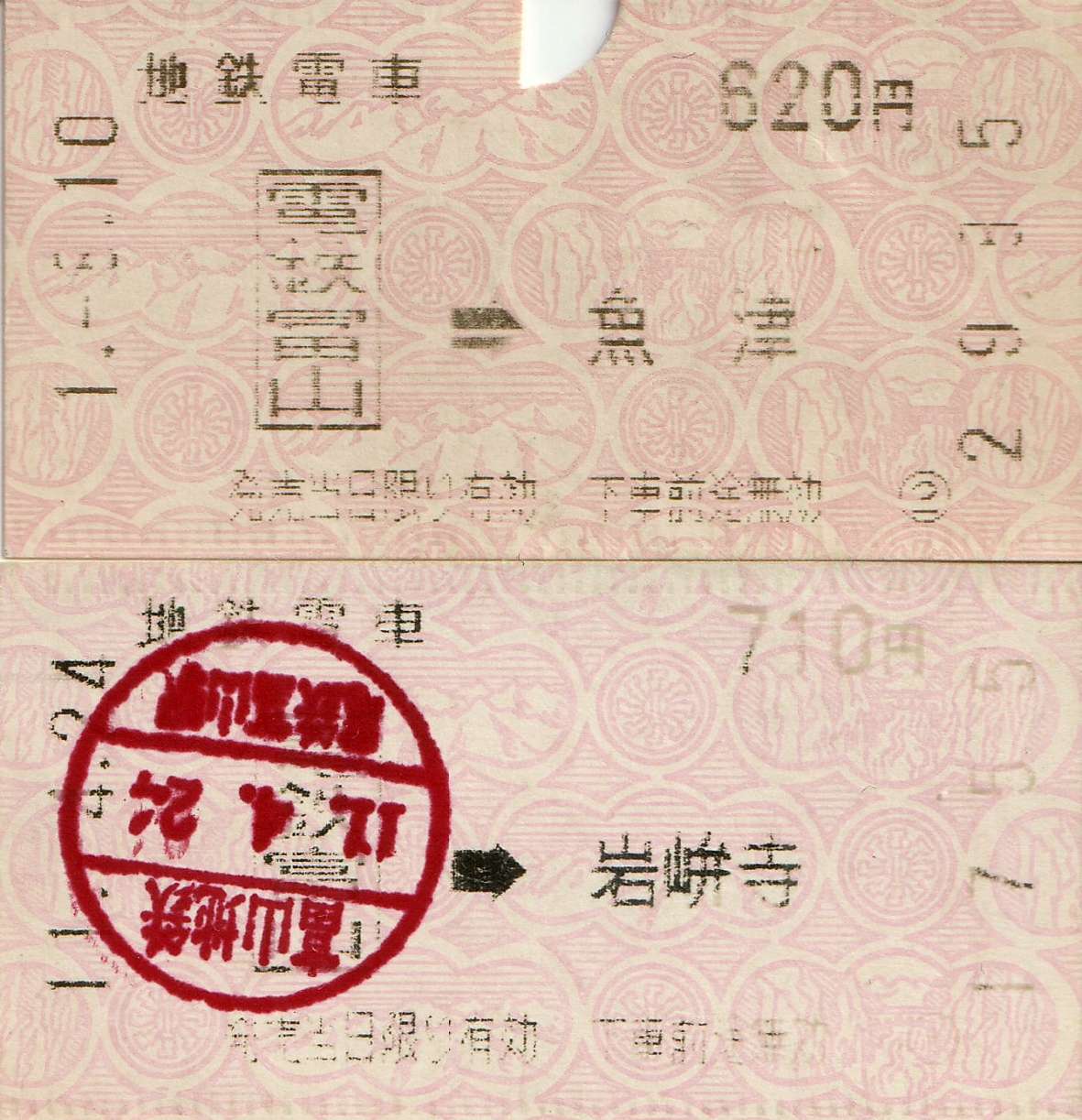 上の魚津行きっぷは改札口で入鋏され扇形の鋏痕が入っていますが、それから約10年経った岩峅寺行きっぷは改札スタンプに取って代わられていました。