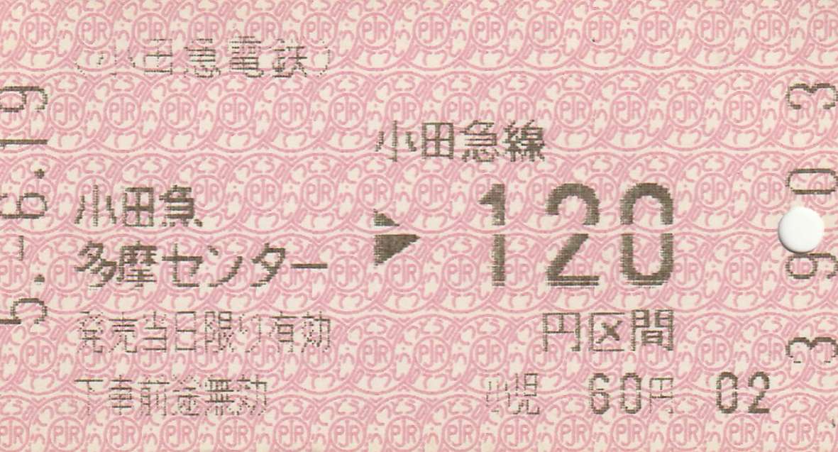 次も大手私鉄・小田急電鉄ですが、このきっぷもPJR地紋です。上でPJR地紋は中小私鉄に多いなどと書いてしまいましたが、特に関東方面では大手・中小関係なく広く普及していたようですね。