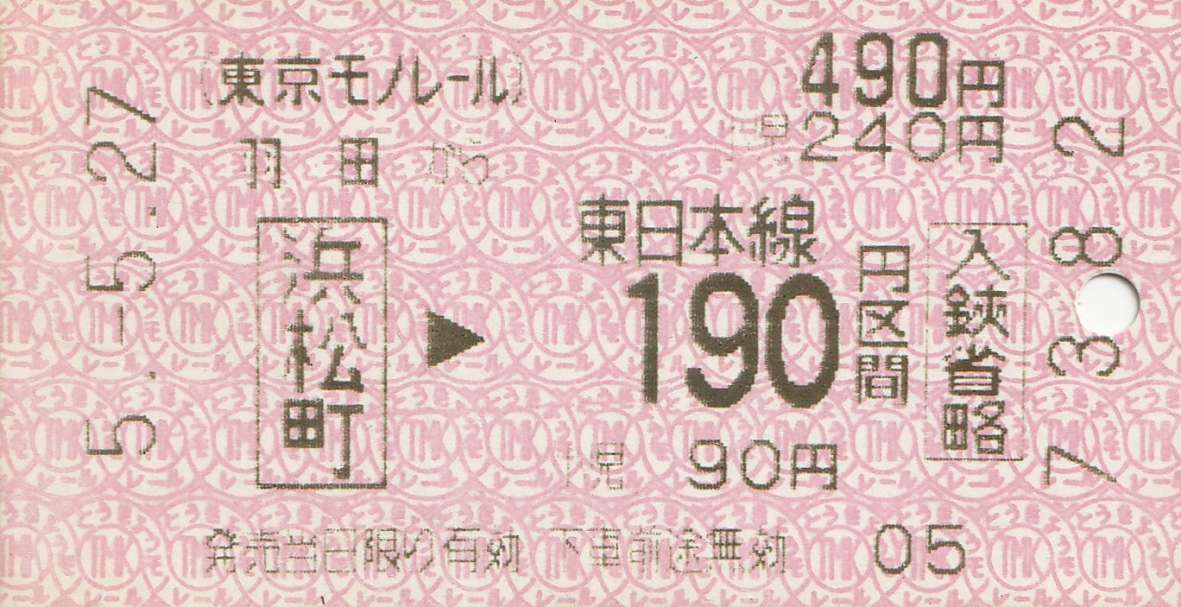東京モノレール羽田駅(現・天空橋駅)から浜松町駅経由のJR連絡きっぷで、地紋は「TMK とうきょうモノレール」。