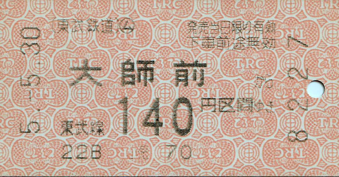 東武鉄道伊勢崎線西新井駅と大師前駅のひと駅間を結ぶ東武大師線大師前駅発のきっぷ・・・ではありますが、実際に発売している場所は西新井駅の中間改札です。大師前駅は券売機も改札もない無人駅で、大師前駅から乗った人は西新井駅下車後に中間改札横の券売機で目的地までのきっぷを買って中間改札機を通り、乗り換えホームや出口に行くこととなっていました。