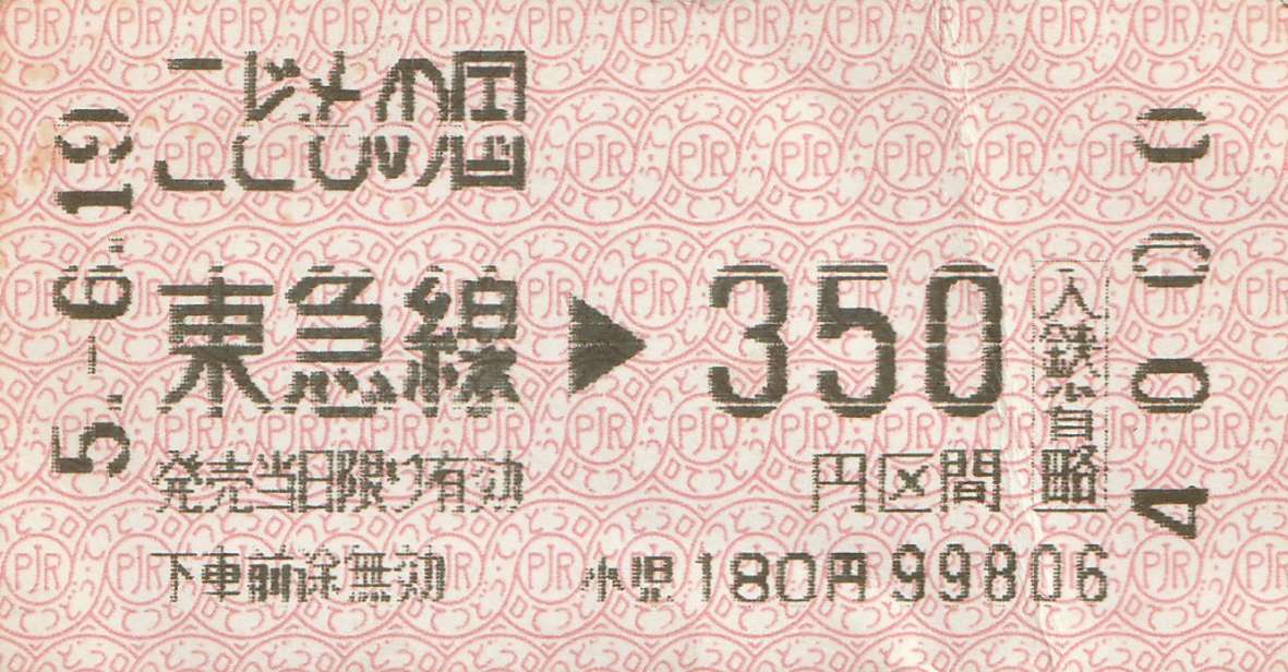 東急電鉄こどもの国線こどもの国駅から350円区間。今もそうですがこどもの国線の運賃は線内打ち切り計算で、長津田駅で田園都市線に乗り継ぐ場合の運賃は合算となります。それでも当時の東急の350円はかなり高額運賃の部類で、この時は渋谷駅まで買って営団地下鉄(当時)の1日乗車券併用で手元に残したものと思います。