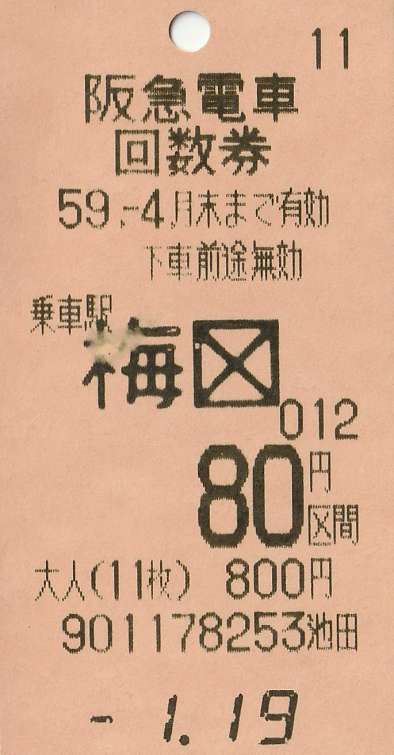 阪急はのちに券売機で磁気券の自動化回数券を発売するようになりました。バラの磁気券が11枚発行されるというもので、改札機に投入すると「乗車駅」欄に乗車駅名が印字されて出てきます。
