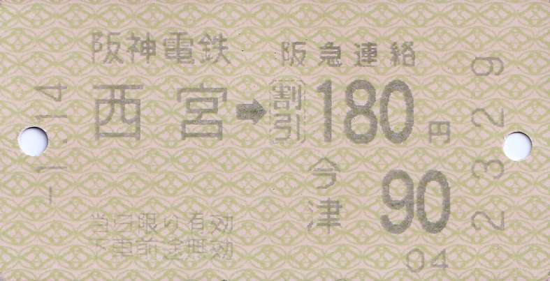 次は阪神電鉄本線と阪急今津線の今津駅での乗継割引きっぷで、双方の初乗り区間内相互間のきっぷは運賃からそれぞれ大人20円ずつ割り引くというものです。