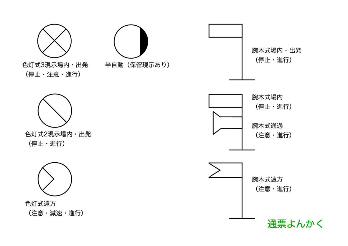 引用の線路図に出てくる信号機記号は次のとおりです。腕木式信号機なんかそのまんまですね。