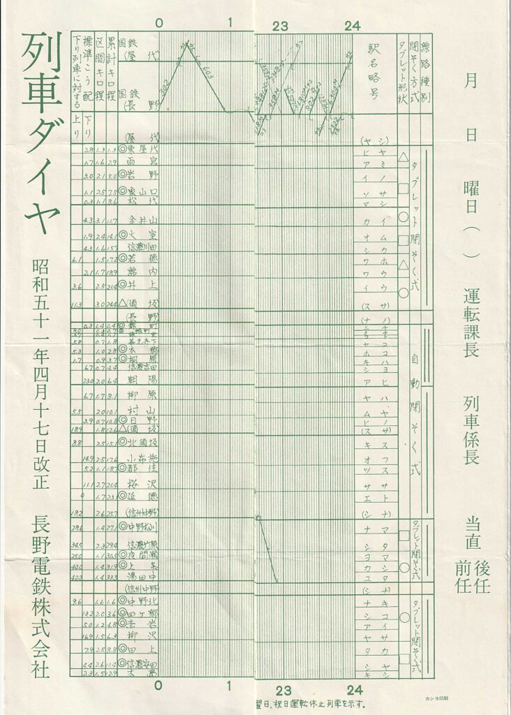 そして、今となってはもう骨董品の部類ではないかと思うのですが、長野電鉄の昭和51(1976)年4月改正ダイヤグラムです。