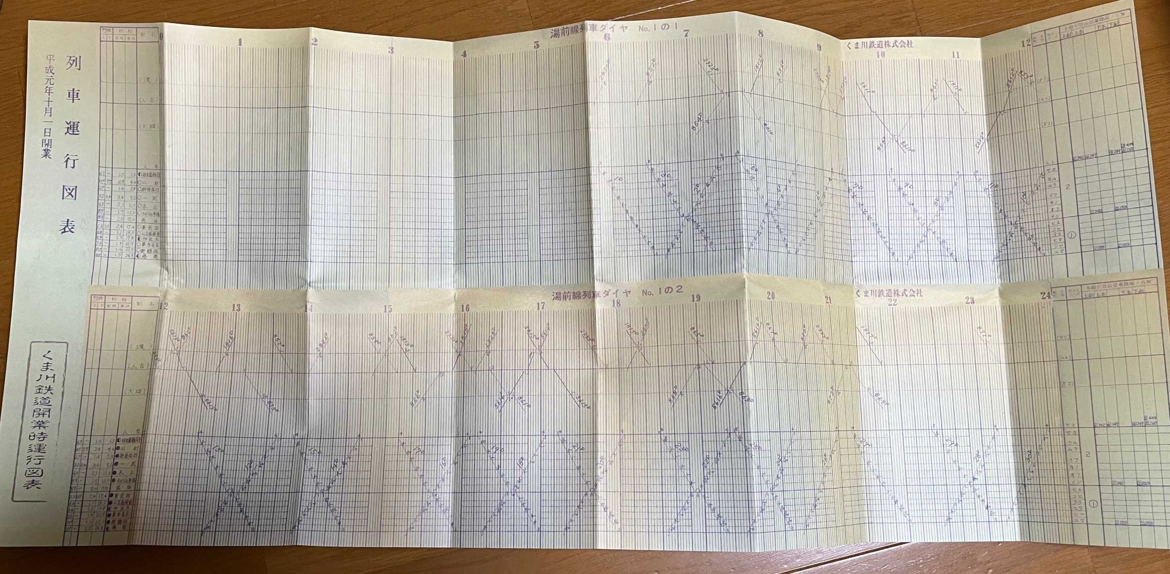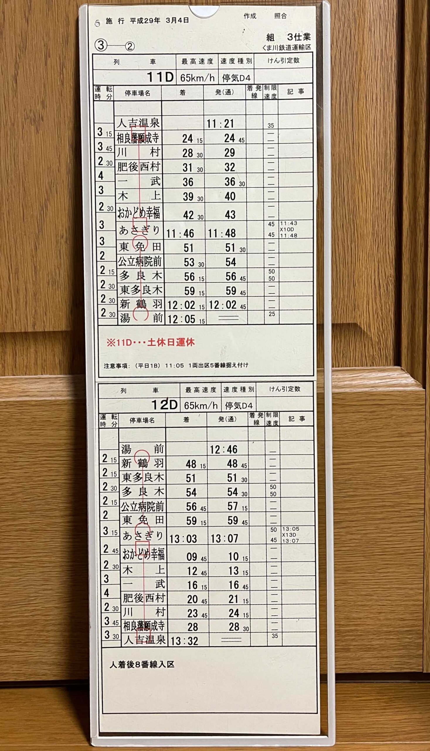 巻いたままだと中身が分からないので、くま鉄運転士用時刻表の裏に貼ってみました。