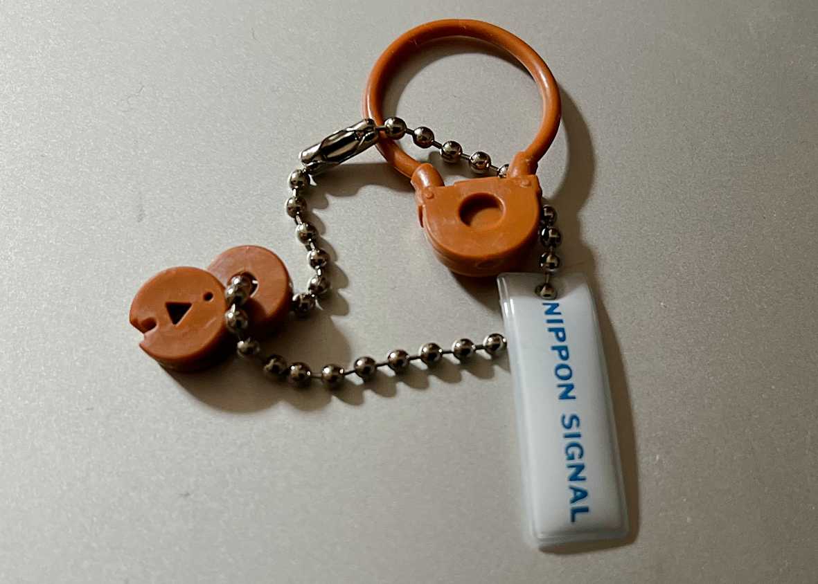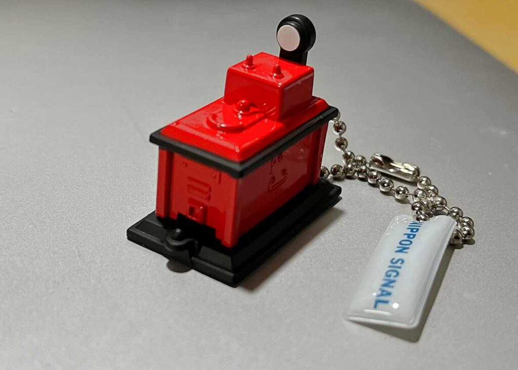 そして通票閉そく器ストラップ。上のような玉とキャリアのものは他にもありそうですが、閉そく器までストラップ化したものは大変貴重…というかこれが唯一ではないでしょうか。サイズは長さ3cm×幅2cm×高さ3cmほどで、実際にストラップとして使おうとすると結構邪魔になると思います(笑