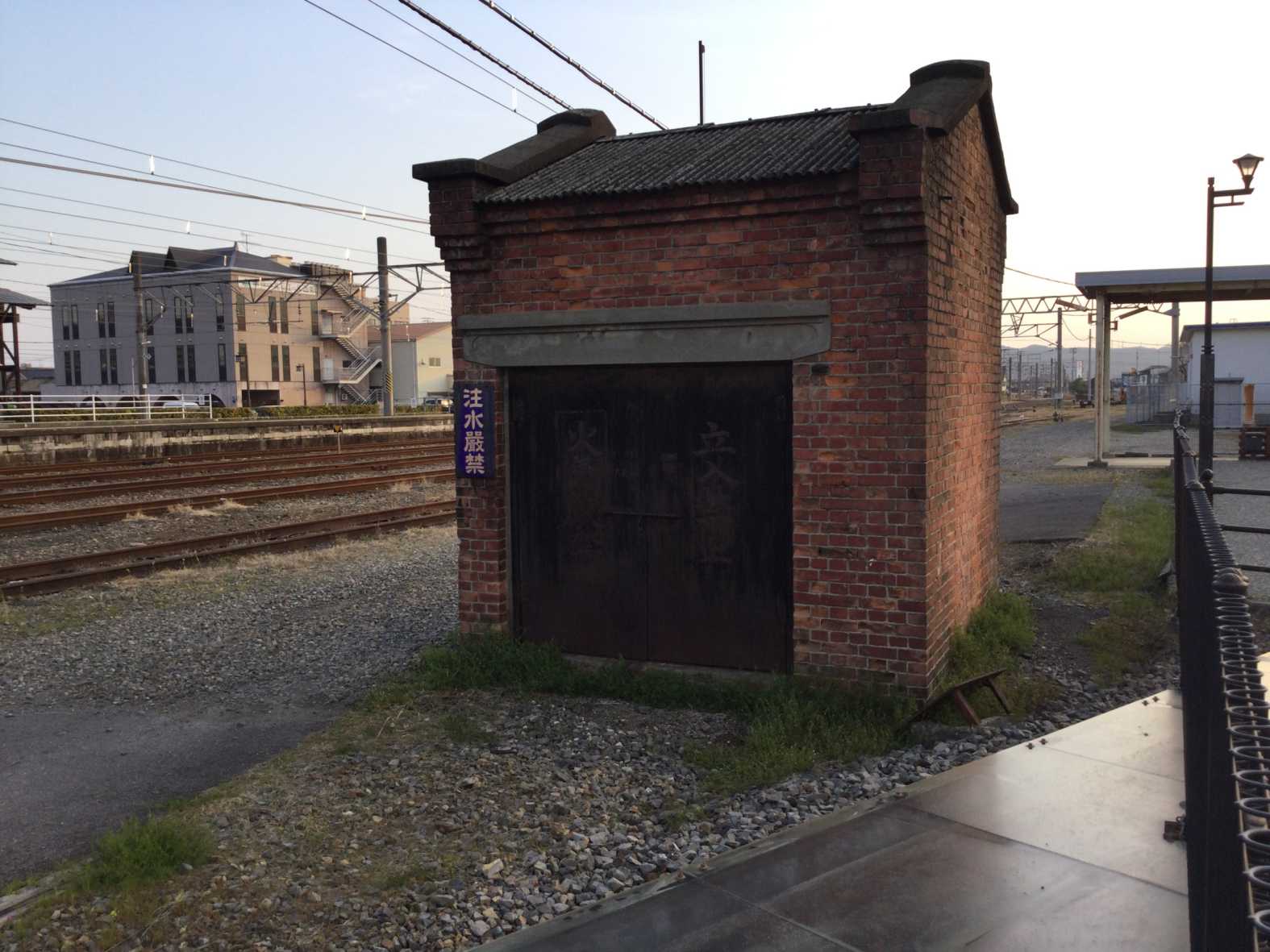 この引き込み線のすぐ横にあるレンガ造りの建物は、ランプ小屋とも呼ばれるカーバイド(炭化カルシウム)倉庫。かつてはカーバイドに水を加えて生成したアセチレンでランプを灯し、夜間整備作業の照明に使っていたそうです。「注水厳禁」「火気厳禁」の表示はそのためなんですね。