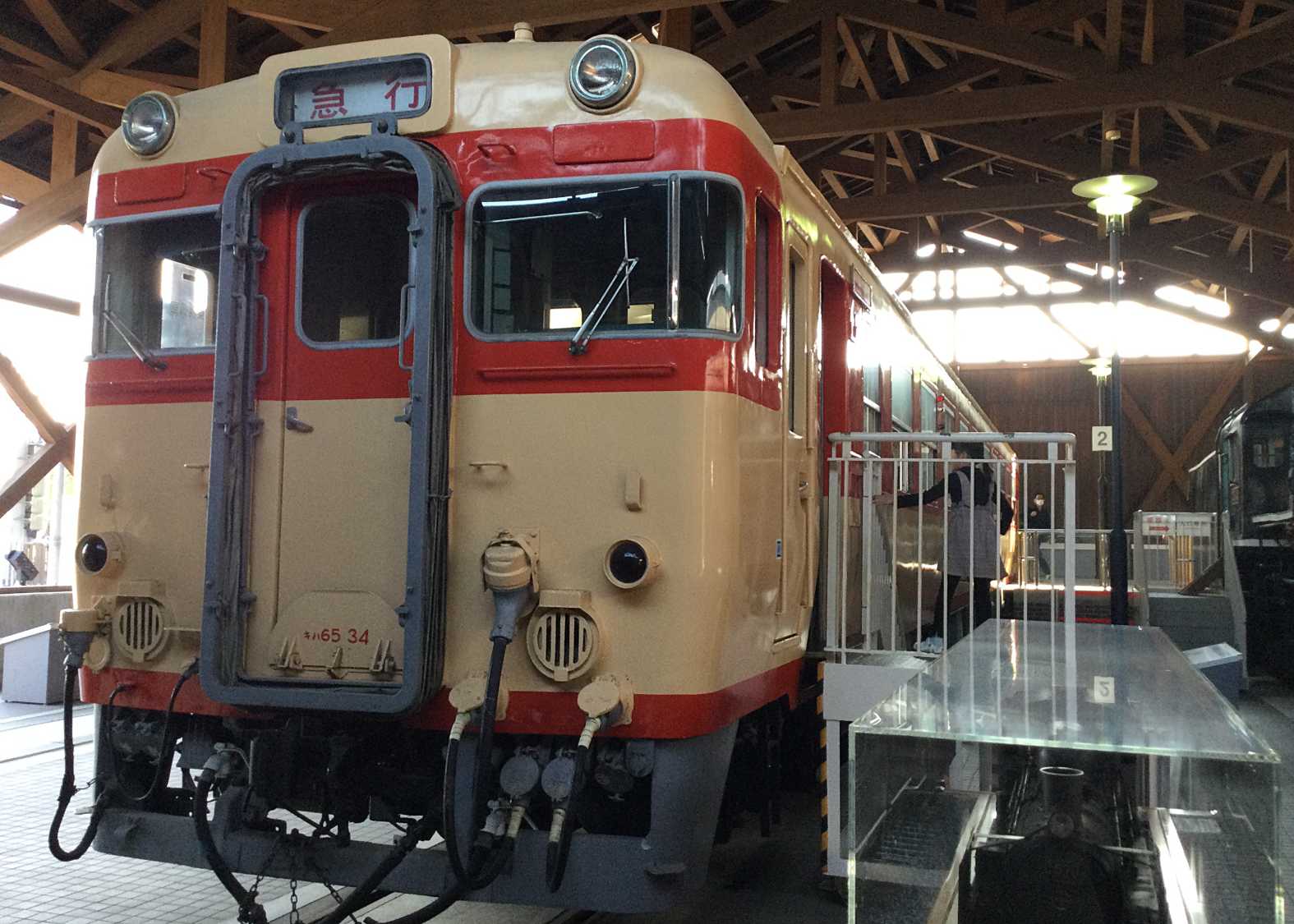 南館の中にも展示車両が3両。センターを張るのは、四国では高松所に集中配置されて各線を走り回った強力型急行気動車キハ65の34号車です。
