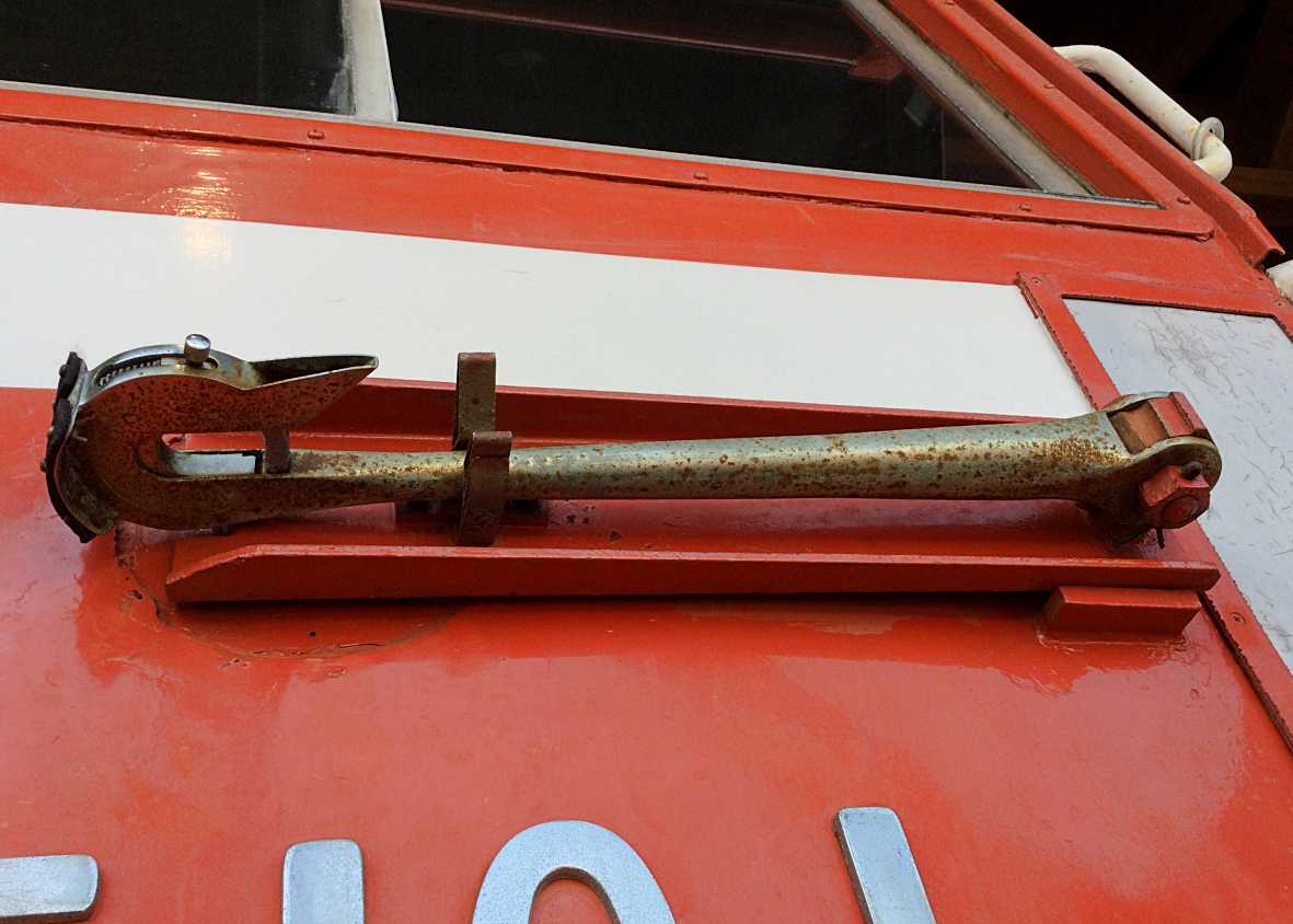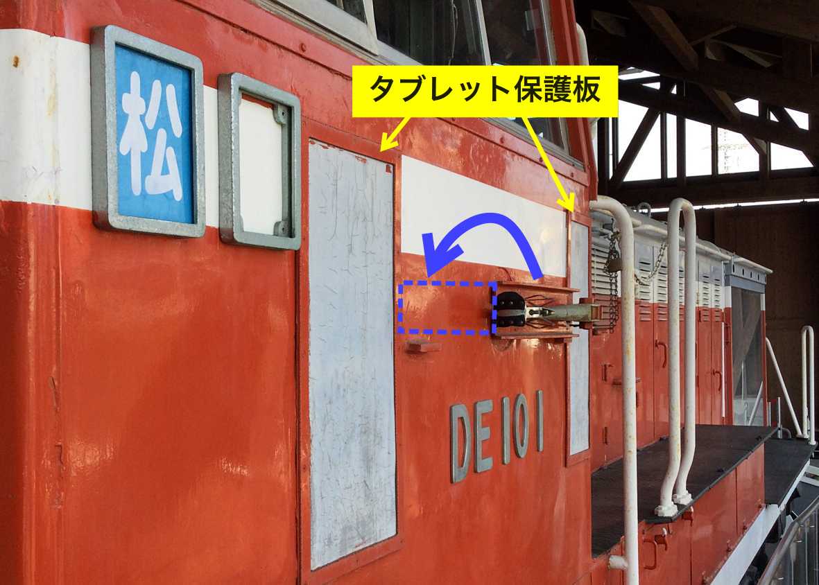 DF50とは違って1つの運転台しかないDD51とDE10は運転方向によりタブレットキャッチャーの向きを変える必要があるため、キャッチャーのフック側(写真左側)を中心に車体に沿って180度回転させることにより、双方向でのキャッチャー使用を可能にしていました。