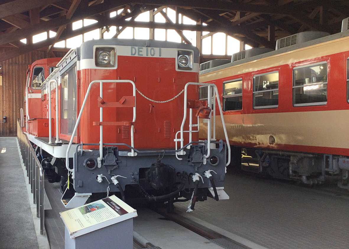 キハ65をはさんで反対側にあるのはDE10のトップナンバー。一足先にデビューしたDD51ではオーバースぺックとなるような亜幹線や支線区または構内入換作業で活躍し、JR四国では全車引退しましたが現在もJR他社や私鉄の譲渡車の多くが現役です。