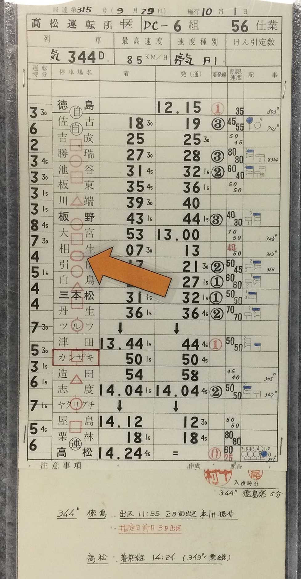 通票種別入りの高徳線上り普通列車の乗務員用時刻表で、同線は1977(昭和52)年2月に全線自動閉そく化されているのでかなりの年代モノです。ちなみに当時は「高徳本線」でした。