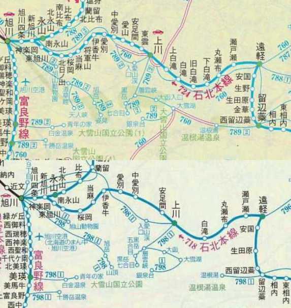 閑散駅の廃止という点で先例となる石北本線では、昭和・平成年代に上越、中越、奥白滝、下白滝の各駅が信号場化され、棒線駅の旧白滝駅(白滝-下白滝信号場)と交換可能駅の天幕駅(上川-中越信号場間)が廃止となっています。これ以外でも令和にかけて棒線駅の廃止が相次ぎ、新旭川-留辺蘂間の地図が大きく変わっています。