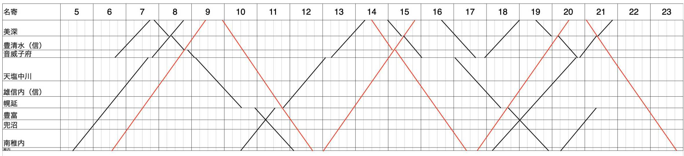 では列車の運行状況は?と思い、特に廃駅の多い名寄駅以北のダイヤグラムを引いてみました。